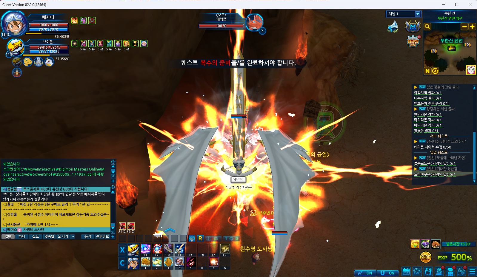 무한산 퀘스트 진입까지했다 일이있어 일단 던전에서 나왔더니 재진입도안되고 복수의 준비를 완료하라고 나옵니다