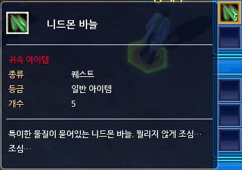 해당 퀘스트를 수락 후 NPC 장태수 뒤에 있는 몬스터 “니드몬”을 처치하면 퀘스트 아이템 “니드몬 바늘”이 드랍됩니다.