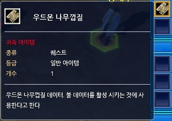 해당 퀘스트를 수락 후 NPC 장태수 뒤에 있는 몬스터 “우드몬”을 처치하면 퀘스트 아이템 “우드몬 나무껍질”이 드랍됩니다.