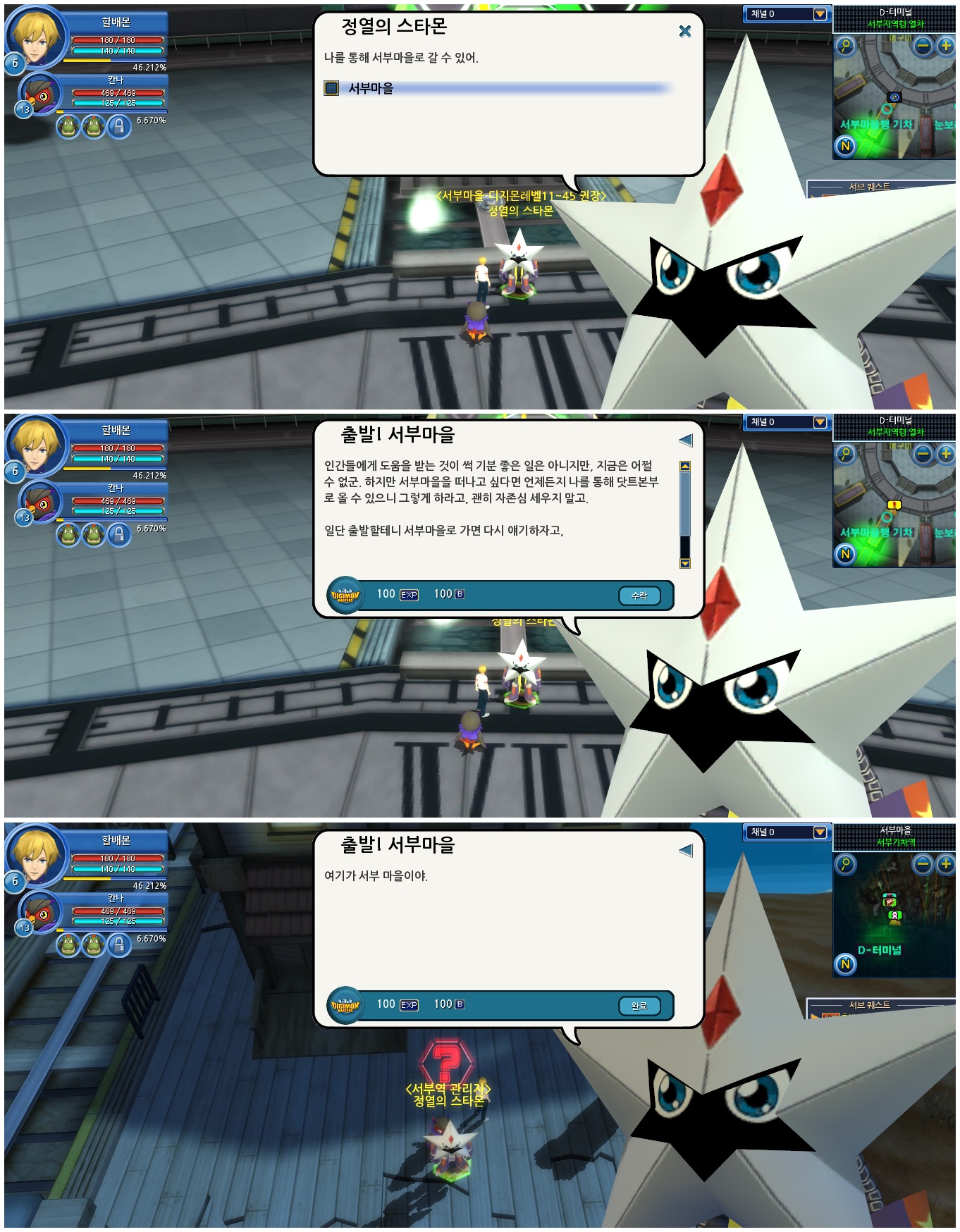 퀘스트를 수락 후 NPC 정열의 스타몬에게 대화를 걸어 [서부마을]을 클릭합니다.
