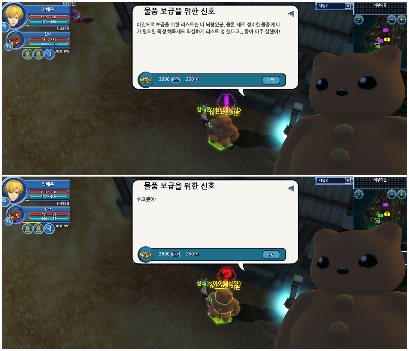 해당 위치로 이동하면 퀘스트 완료조건이 충족되며, 다시 서부마을의 NPC 머드프리지몬<아이템 상인>에게 되돌아가 퀘스트를 완료 받습니다.