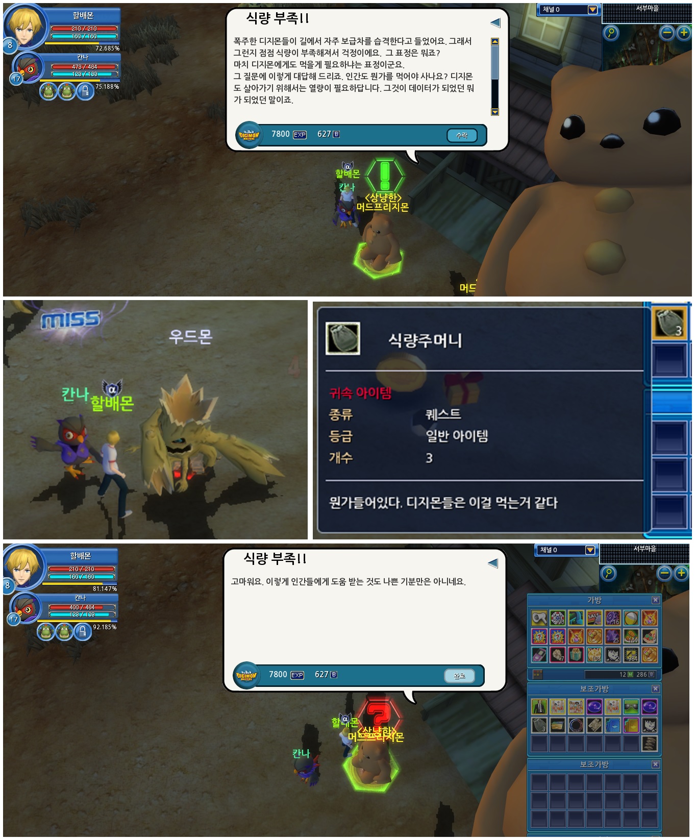 식량주머니 3개를 얻은 뒤 NPC 머드프리지몬<상냥한>에게 되돌아가 완료합니다.
