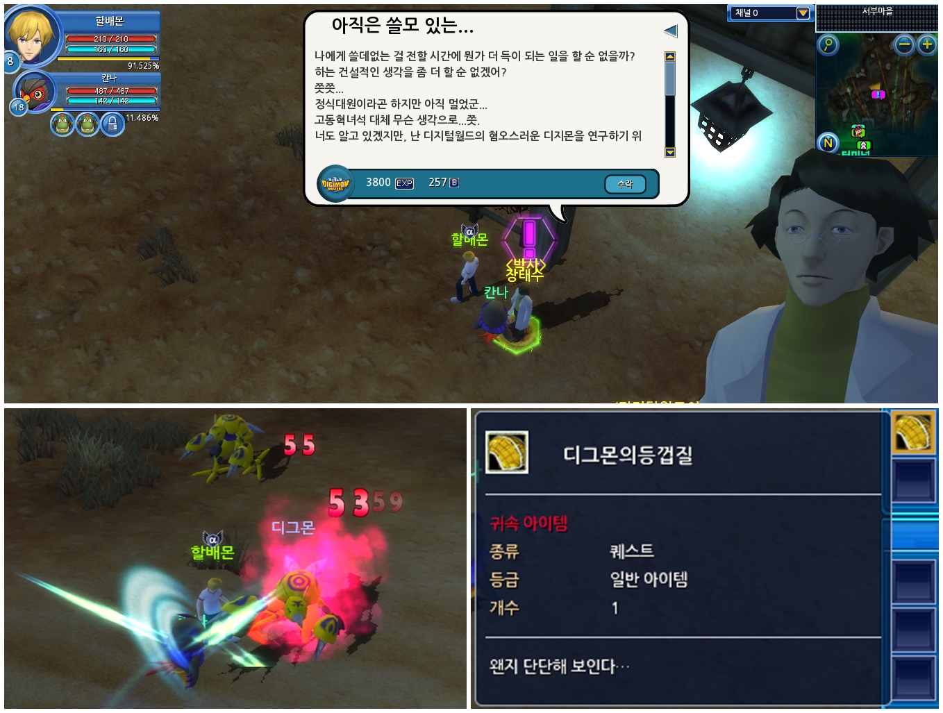 디그몬에게서 디그몬의등껍질 5개를 얻은 뒤 NPC 장태수에게 되돌아가 완료합니다.